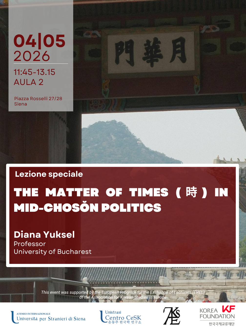 Il Centro di Ricerche e Studi Coreani "Yun Dongju" vi invita ad un seminario tenuto dalla prof.ssa Diana Yuksel della University of Bucharest, che condividerà con gli intervenuti il risultato delle sue ricerche sul concetto dei "tempi", in sino-coreano si (時) negli scritti politici della metà dell'epoca Chosŏn. Il seminario offrirà un’occasione di approfondimento su una nozione chiave del pensiero politico e filosofico coreano premoderno, mettendo in luce le sue implicazioni nel contesto storico e culturale del periodo. L'evento è stato finanziato dallo European Program for the Exchange of Lecturers (EPEL) della Association for Korean Studies in Europe. Informazioni:cesk@unistrasi.it