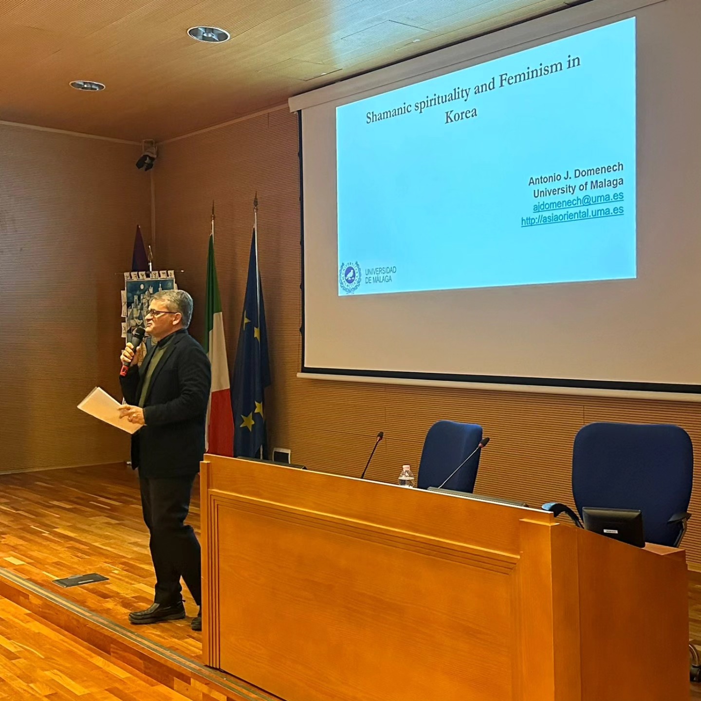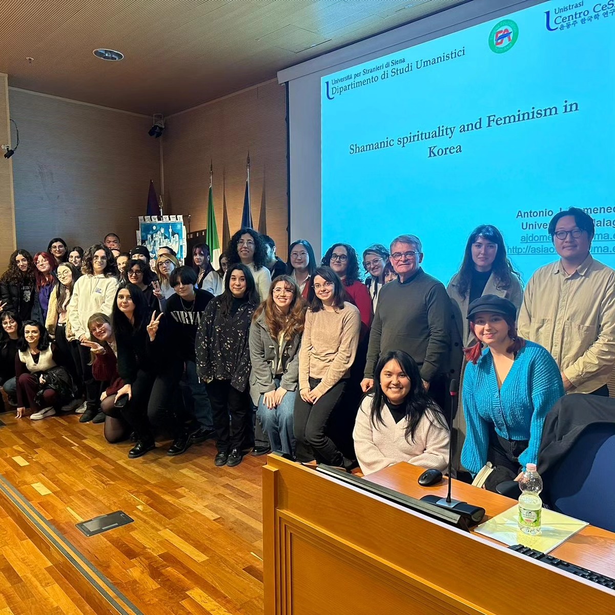 In questa conferenza il prof. Antonio Doménech Josè del Río dell'Universidad de Málaga, esperto di studi antropologici e culturali coreani, ha illustrato le sue ricerche nel complesso ambito dello sciamanesimo tradizionale coreano, fenomeno religioso e culturale di antica tradizione ma che continua a mantenere una presenza significativa nella società sud-coreana contemporanea. Durante la sua presentazione, il professor Doménech ha discusso se e come lo sciamanesimo coreano possa essere considerato “femminista” nelle sue manifestazioni sociali e rituali e il modo in cui esso interagisce con i ruoli di genere tradizionali e il loro mutamento contemporaneo all'interno della società coreana, oltre al modo in cui l'avvento delle nuove tecnologie sia riuscito a dare impulso a una nuova generazione di sciamane la cui presenza si fa sentire anche nell'innovativo scenario dei social media.
