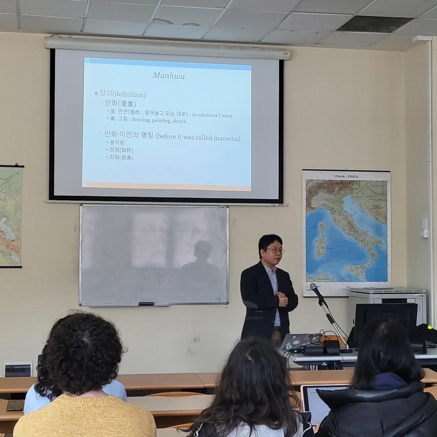 La conferenza del prof. Gwangseok Kim della Jagellonian University di Cracovia è stata incentrata sull'analisi del concetto di manhwa (fumetti coreani tradizionali) e webtoon coreani (fumetti digitali di nuova generazione), esaminando in particolare la loro efficacia pedagogica nell'ambito dell'apprendimento dell'autoespressione in lingua coreana da parte di studenti stranieri attraverso l'utilizzo del mezzo grafico e del disegno, che possono mettere positivamente in gioco la creatività degli apprendenti grazie all'integrazione di elementi visivi e testuali/linguistici. Le studentesse e gli studenti intervenuti hanno poi avuto la possibilità di cimentarsi in prima persona nella creazione di un manhwa a quattro vignette in coreano.